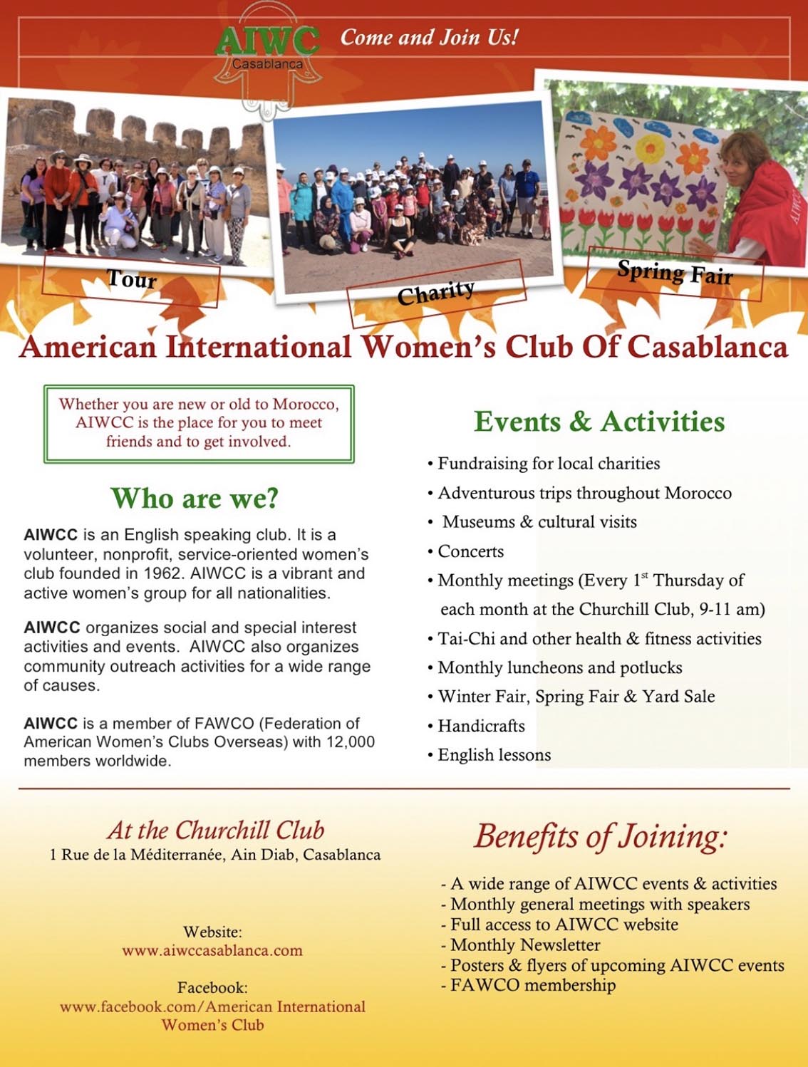 L’AIWCC, fondé en 1962, est un club anglophone qui réunit des femmes de toutes nationalités autour d’activités sociales, culturelles et solidaires : visites, ateliers, cours de langue, rencontres mensuelles, actions caritatives, ventes solidaires, ou encore le Winter Fair et le Spring Fair. Géré par des bénévoles, le club œuvre toute l’année pour créer du lien et contribuer positivement à la vie casablancaise.