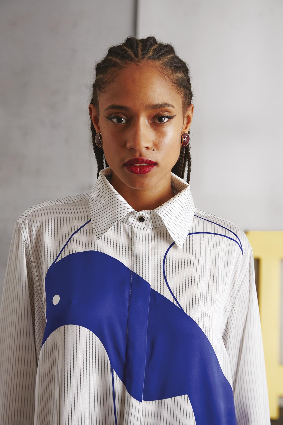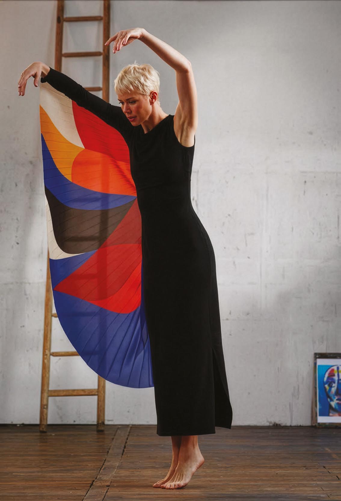 Chaque collection débute par une rencontre : un artiste, une œuvre, une émotion. L’approche est instinctive avant d’être intellectuelle. La créatrice s’inspire des palettes de couleurs, du geste, du mouvement, pour donner vie à des silhouettes vibrantes. « La couleur agit comme un langage », explique-t-elle. En collaborant avec l’artiste REMED, par exemple, elle a créé des pièces asymétriques où l’énergie du geste se transforme en coupe et en volume. Le vêtement devient alors le prolongement d’une œuvre vivante.