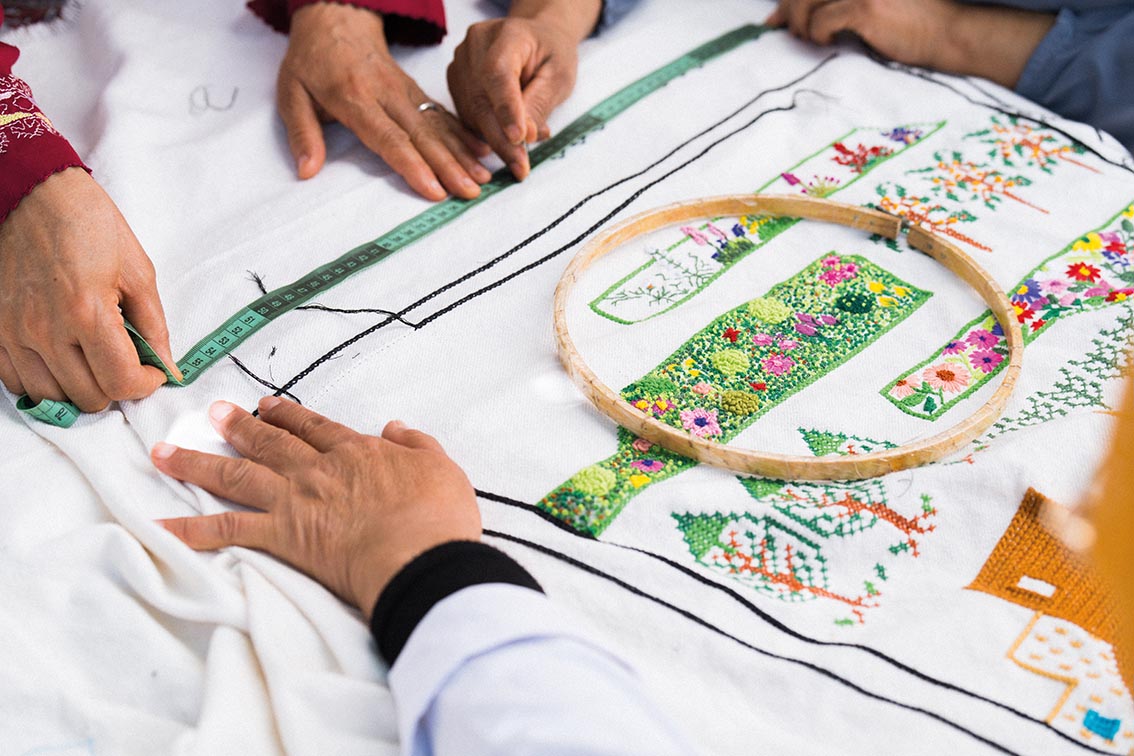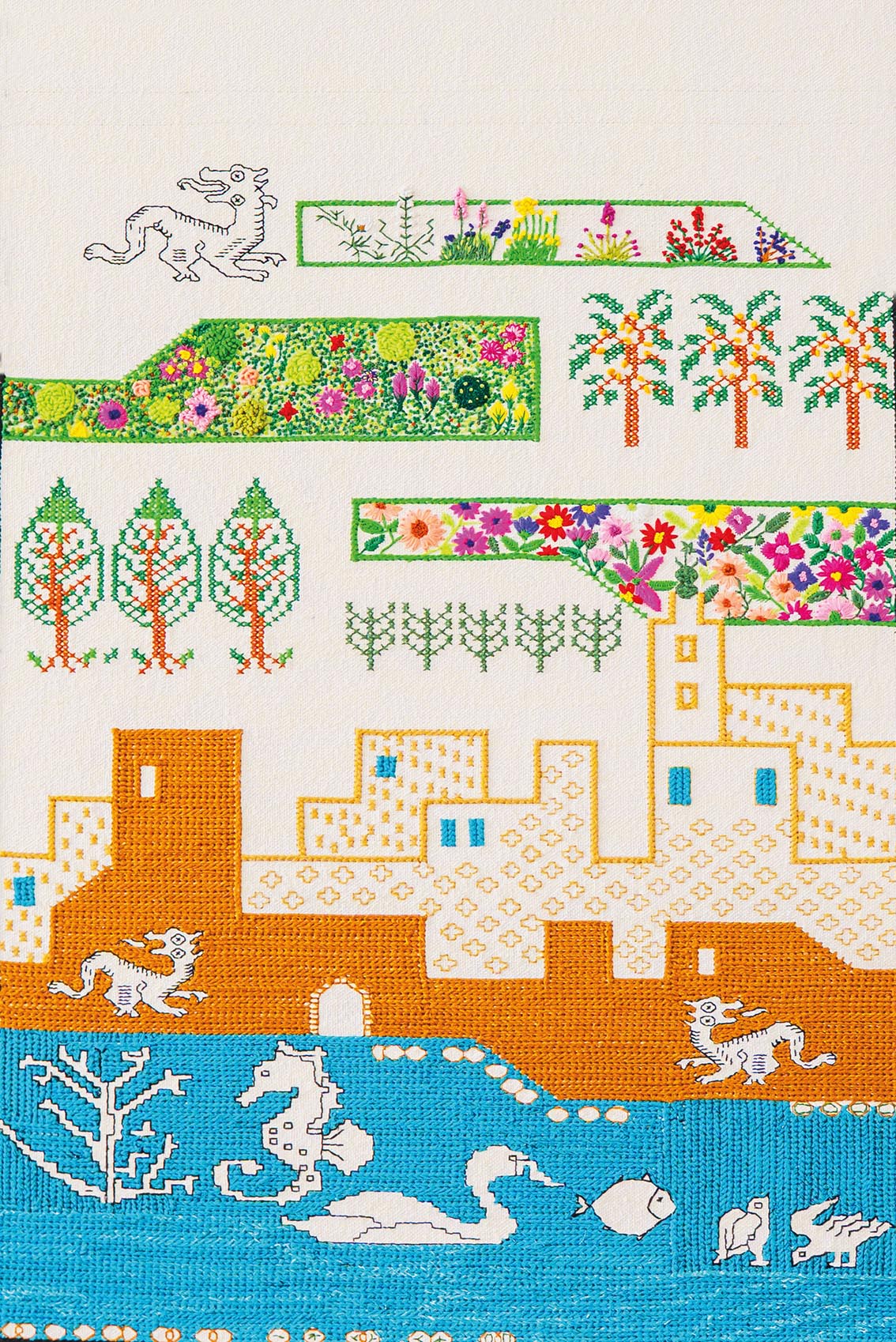 Plus qu’une œuvre d’art, cette broderie est un manifeste. Elle puise dans le terz zemmouri, broderie traditionnelle aux motifs floraux et animaliers, pour donner voix aux femmes et à leur regard sur la ville. À travers le fil et l’aiguille, ce sont des histoires de transmission, d’attachement et de disparition qui se racontent, portées par un savoir-faire ancestral.