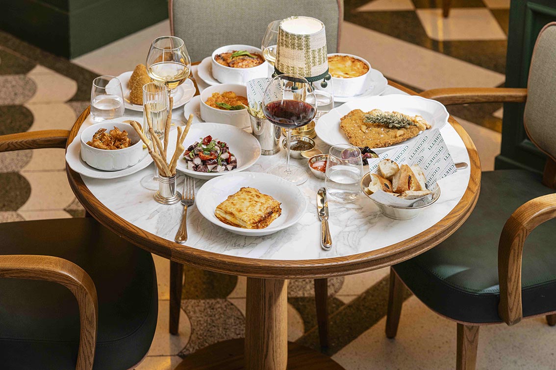 Le design intérieur marie bois clair, marbre et velours dans une atmosphère contemporaine et chaleureuse. L’espace, conçu pour accueillir 90 convives, privilégie l’intimité, la fluidité et le confort, dans une lecture moderne de l’hospitalité italienne.