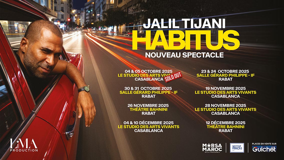 Après le succès fulgurant de Jeux de Société, l’humoriste marocain Jalil Tijani revient avec un nouveau spectacle décapant : Habitus. Sur scène, il explore ce qui nous façonne en silence — habitudes, réflexes, héritages invisibles — avec une plume acérée et une présence magnétique.