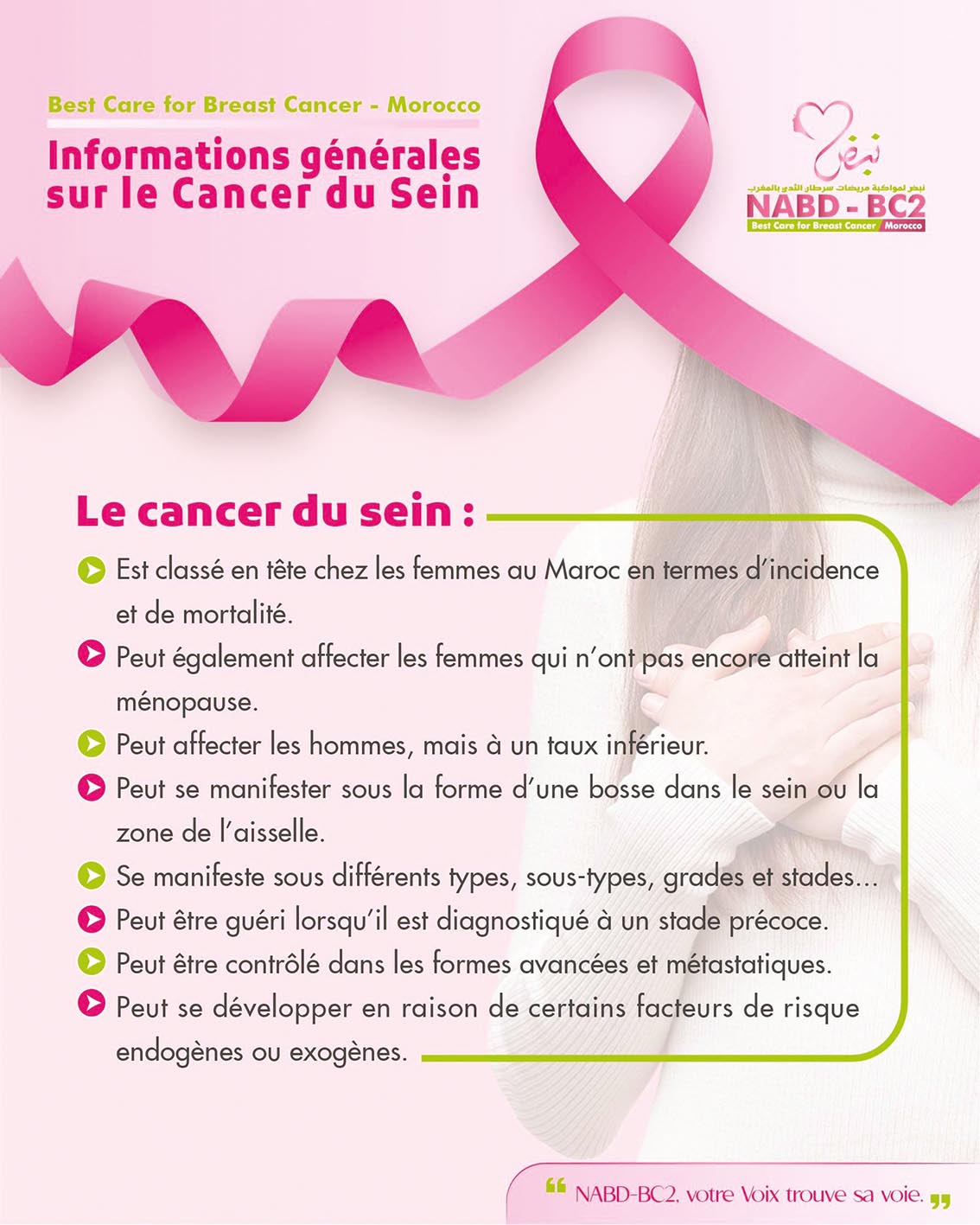 Née de la volonté conjointe de patientes et de médecins, NABD-BC2 est une association marocaine engagée contre le cancer du sein visant à informer, prévenir, accompagner. Elle mène des actions de proximité et organise des journées de dépistage avec ses partenaires.