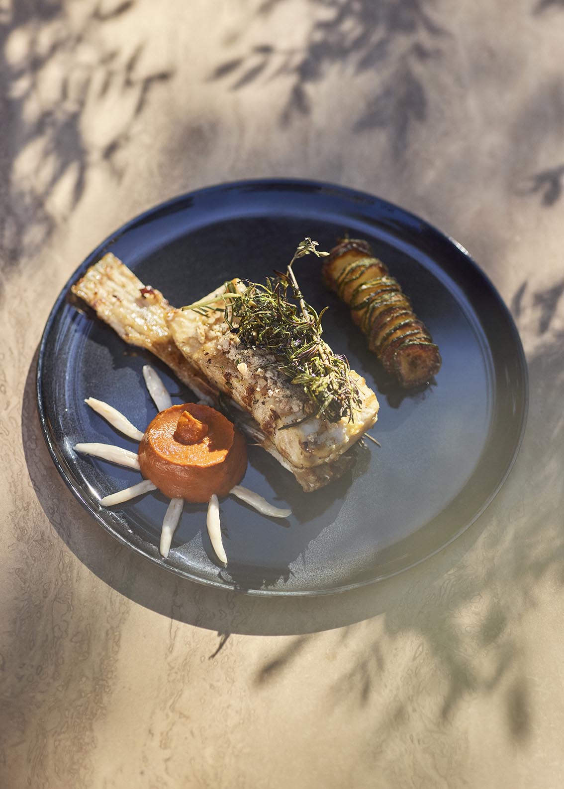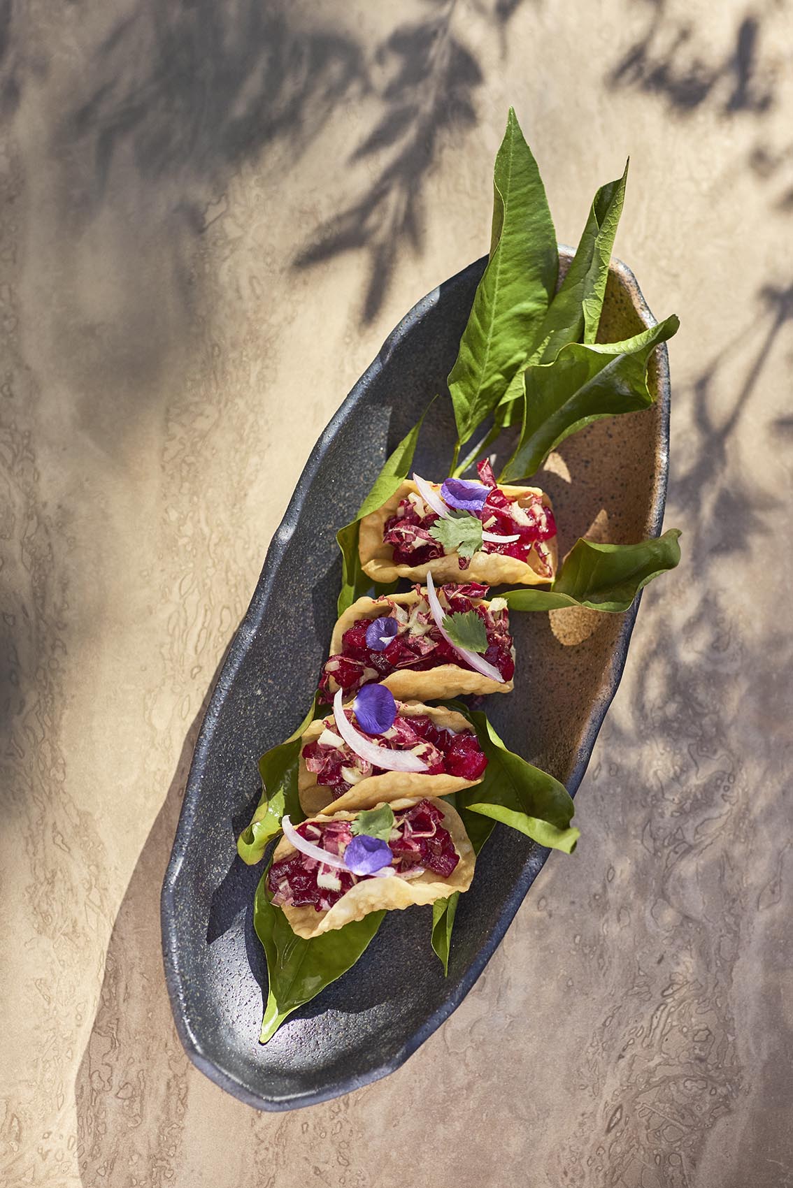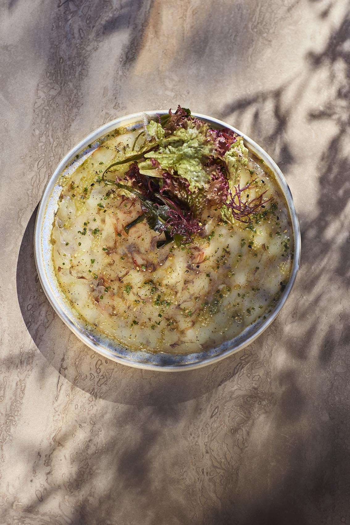À la carte : focaccia au feu de bois et carpaccio de tomates au yuzu, ceviche de bar, mezzi paccheri aux gambas sauvages, nouilles froides au caviar, ou encore tataki de bœuf et calamars sauce coco-citron vert. Chaque plat reflète une approche libre et audacieuse du goût, fidèle à l’esprit des chefs Massimiliano et Raffaele Alajmo.