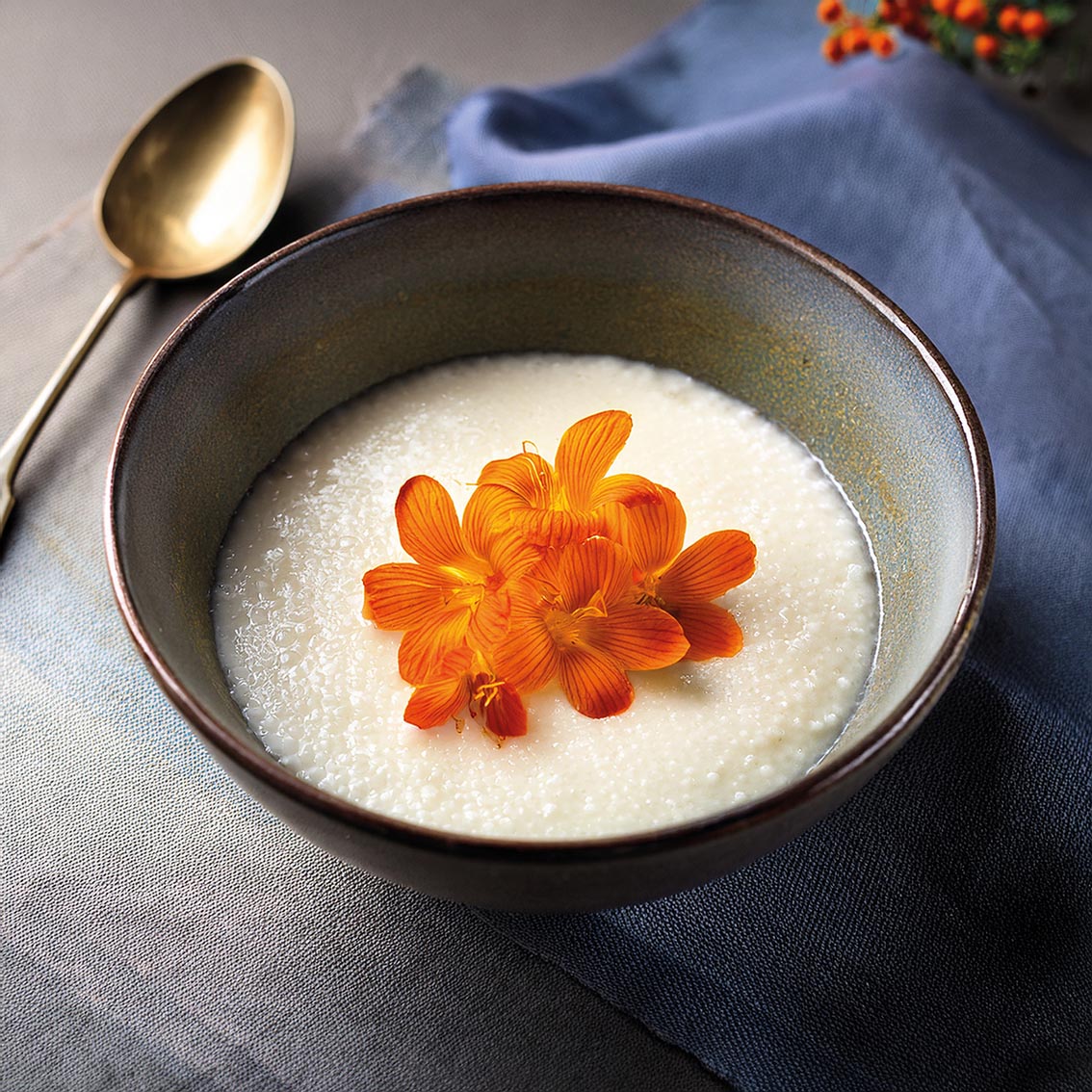 Cuire la semoule dans le lait chaud. Parfumer et parsemer d’amandes.