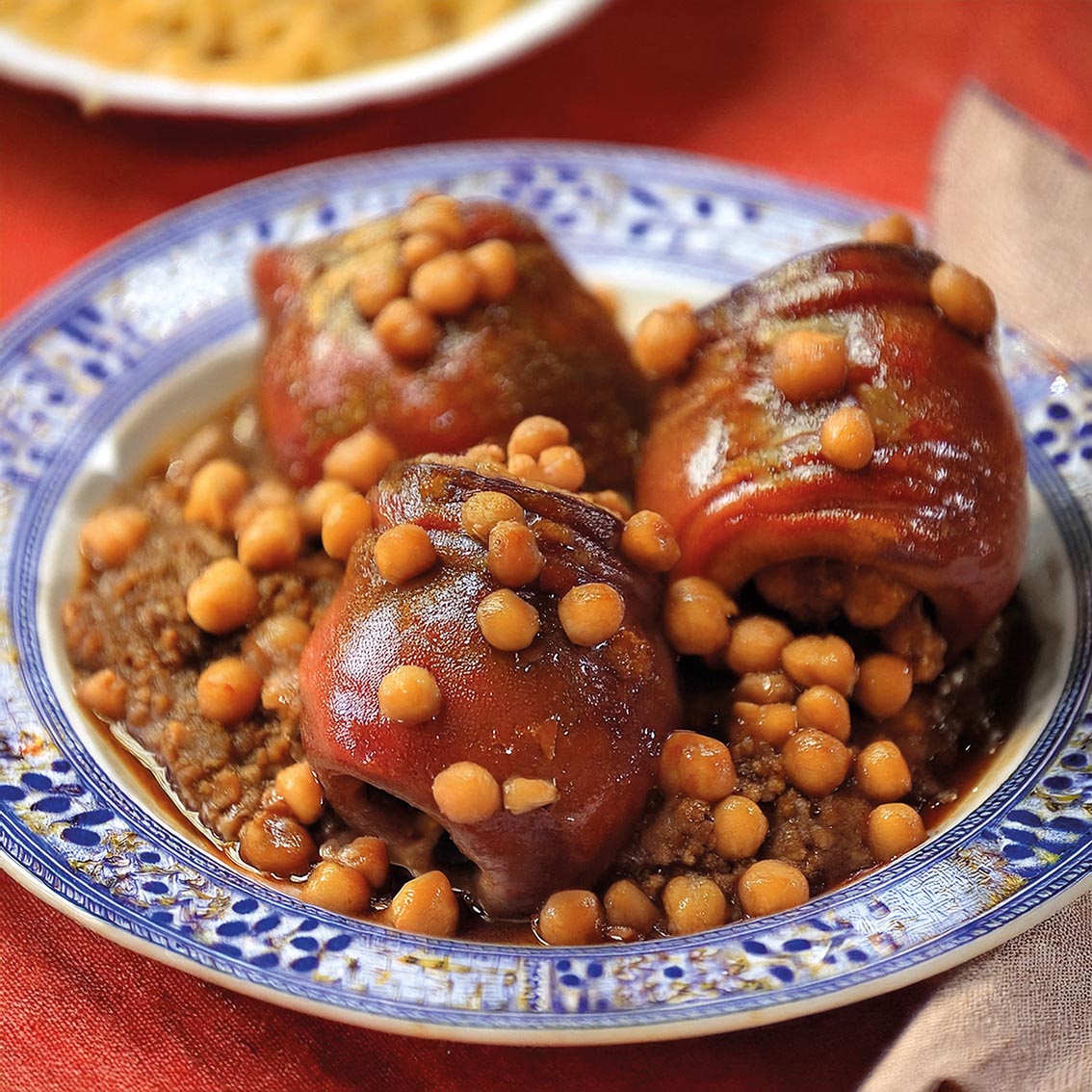 Faire revenir l’oignon et l’ail dans l’huile. Ajouter les pieds de veau, les épices et la tomate. Couvrir largement d’eau et laisser mijoter à feu doux 3 heures minimum, jusqu’à texture fondante.
