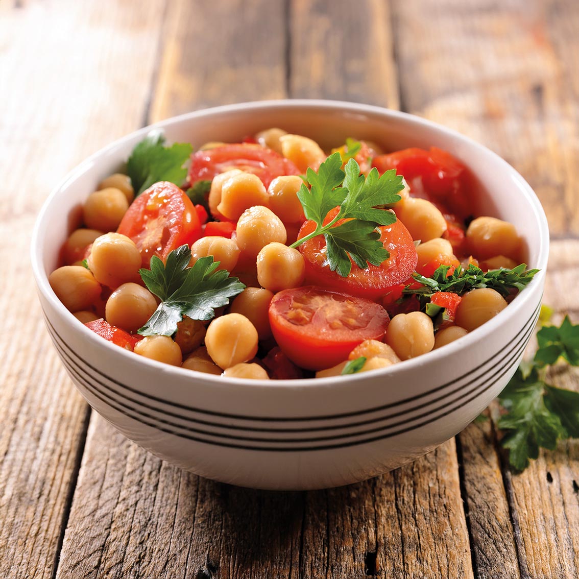 Couper les légumes finement. Mélanger avec les pois chiches, assaisonner et servir frais.