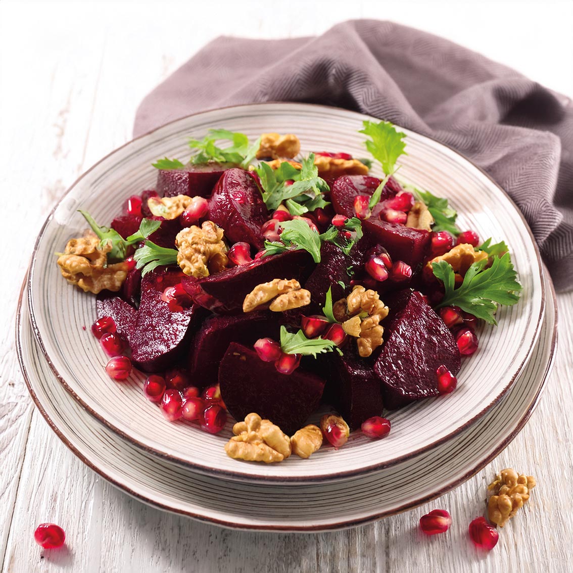 Couper les betteraves. Ajouter grenade et noix. Assaisonner délicatement.