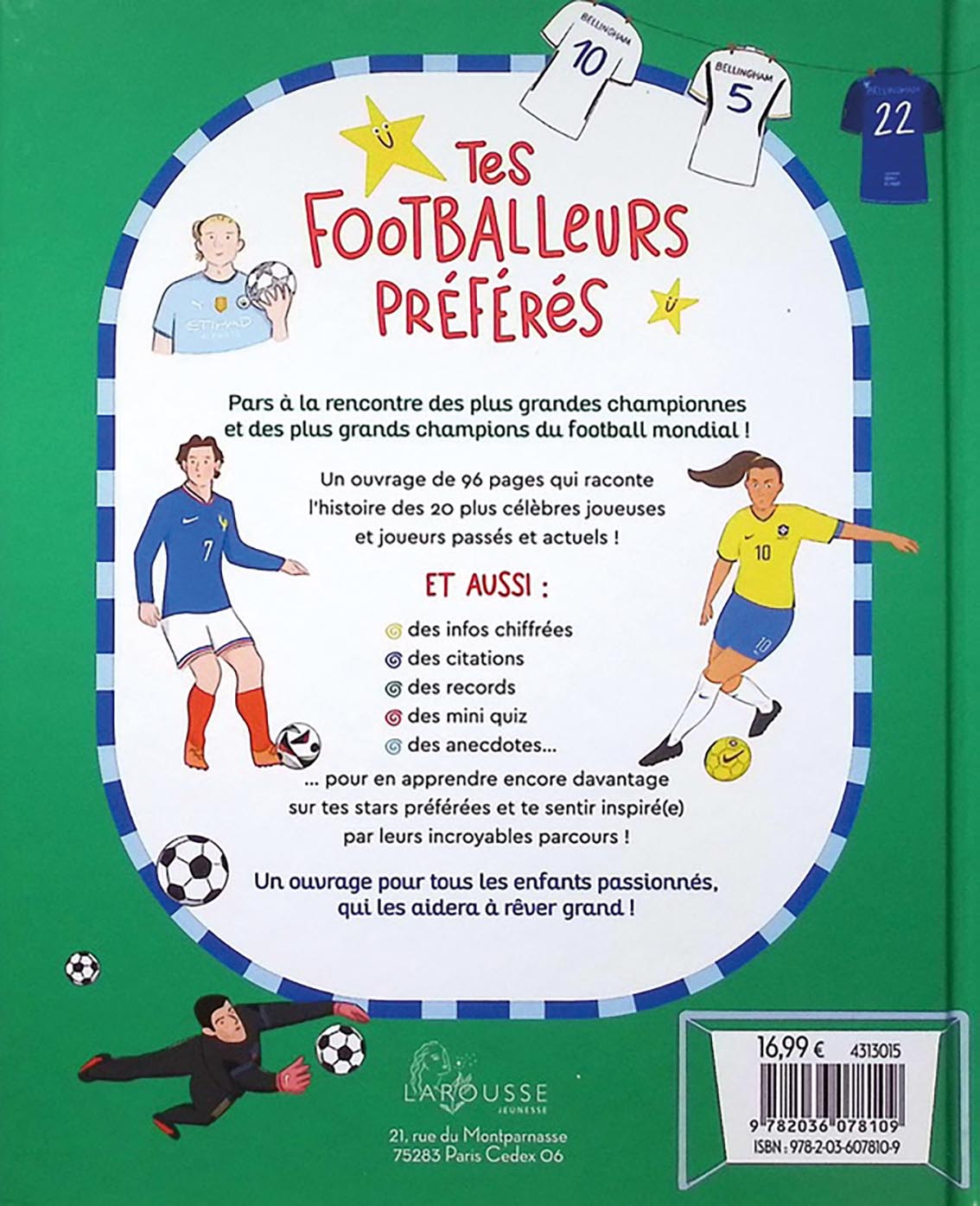 Ce beau livre jeunesse réunit vingt figures inspirantes du ballon rond, filles et garçons confondus. Chaque portrait mêle anecdotes, conseils d’entraînement et citations motivantes. Un ouvrage ludique et positif pour transmettre aux jeunes lecteurs les valeurs de persévérance, d’esprit d’équipe et de respect.