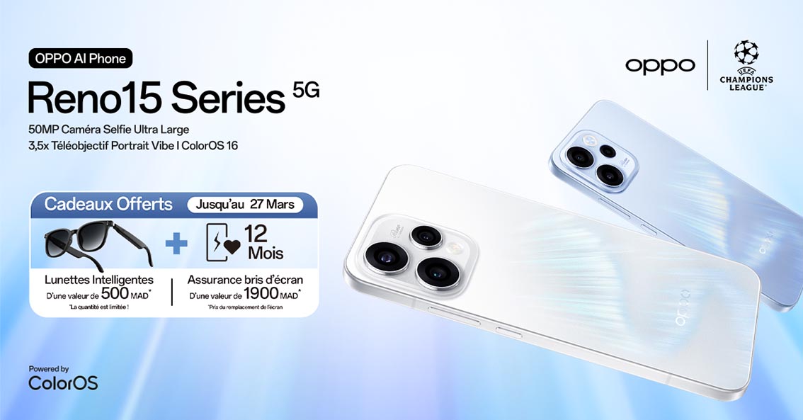 OPPO annonce au Maroc le lancement de la série Reno15 5G, composée des Reno15 5G et Reno15 F 5G, pensée comme un véritable partenaire créatif tout-en-un . Avec un appareil photo selfie ultra grand-angle de 50 MP et une suite d’outils alimentés par l’intelligence artificielle, la marque redéfinit l’expérience de création mobile, de la capture à l’édition, souvent en un seul geste .