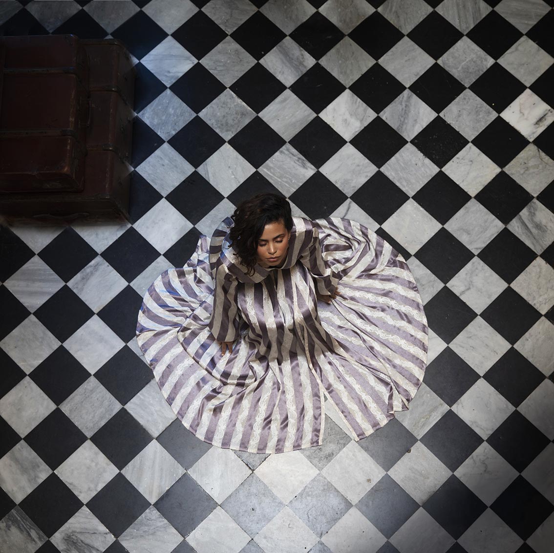 Les images racontent une féminité libre, tantôt majestueuse, tantôt introspective. Une robe s’épanouit en cercle parfait sur un sol damier, tandis qu’un manteau brodé accompagne une montée d’escalier, transformant le geste en rituel. Ailleurs, la silhouette se détend, s’abandonne, comme saisie dans un instant suspendu, entre élégance et abandon.