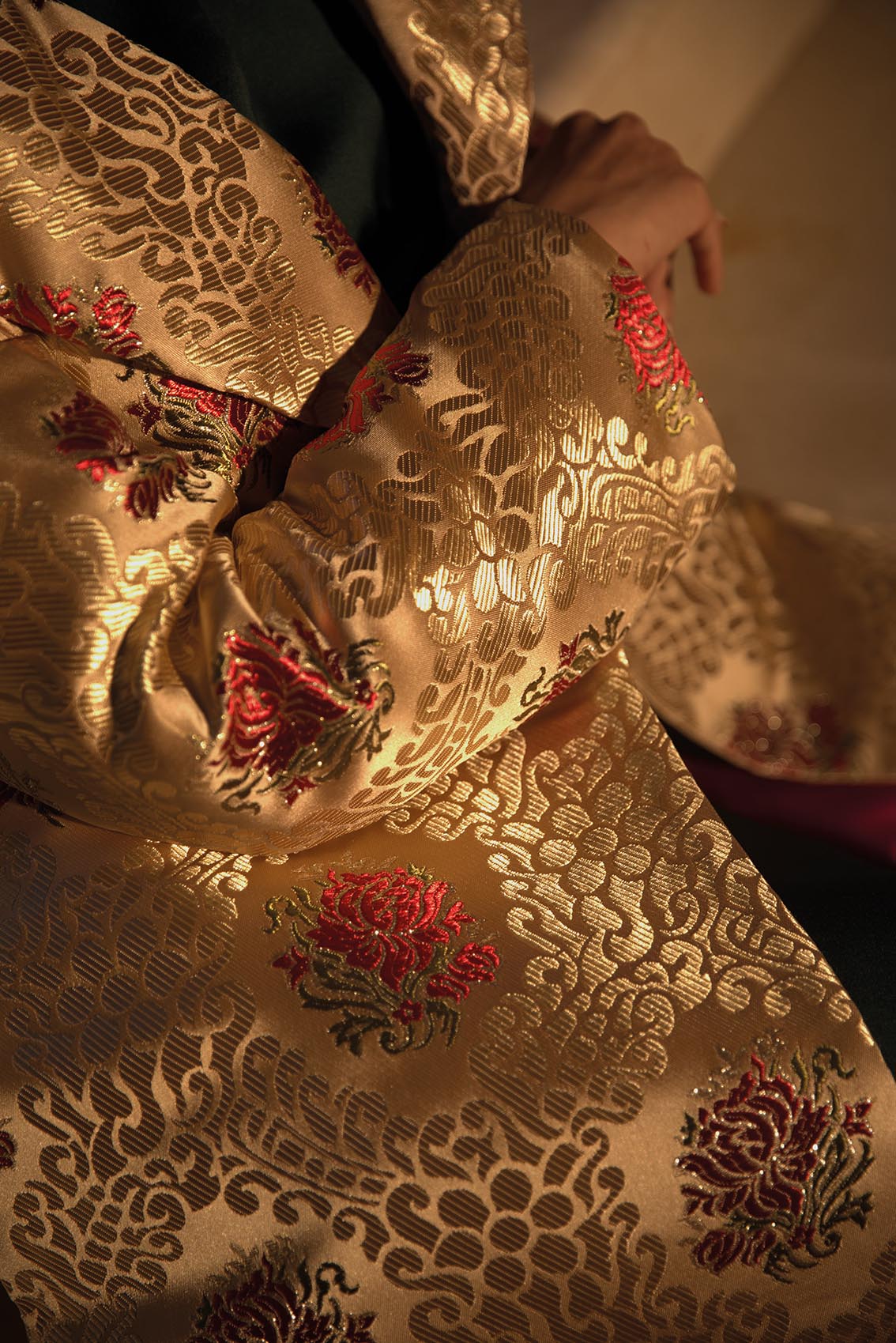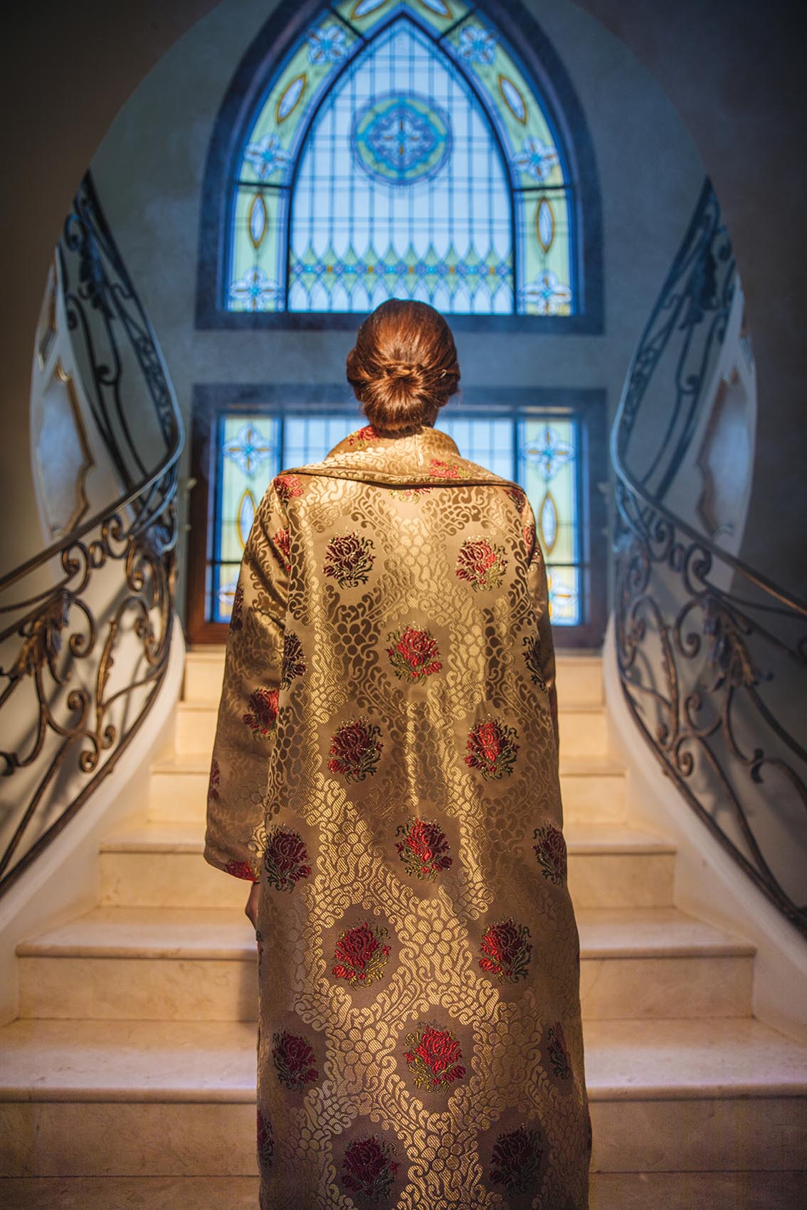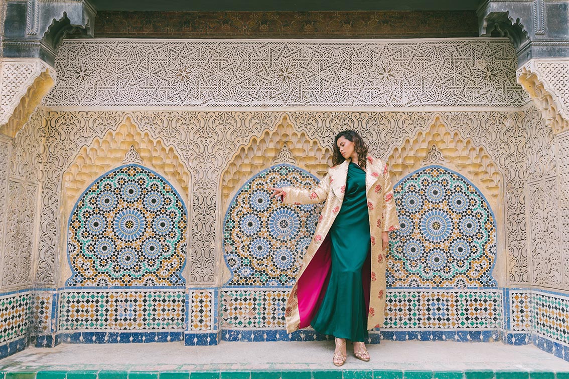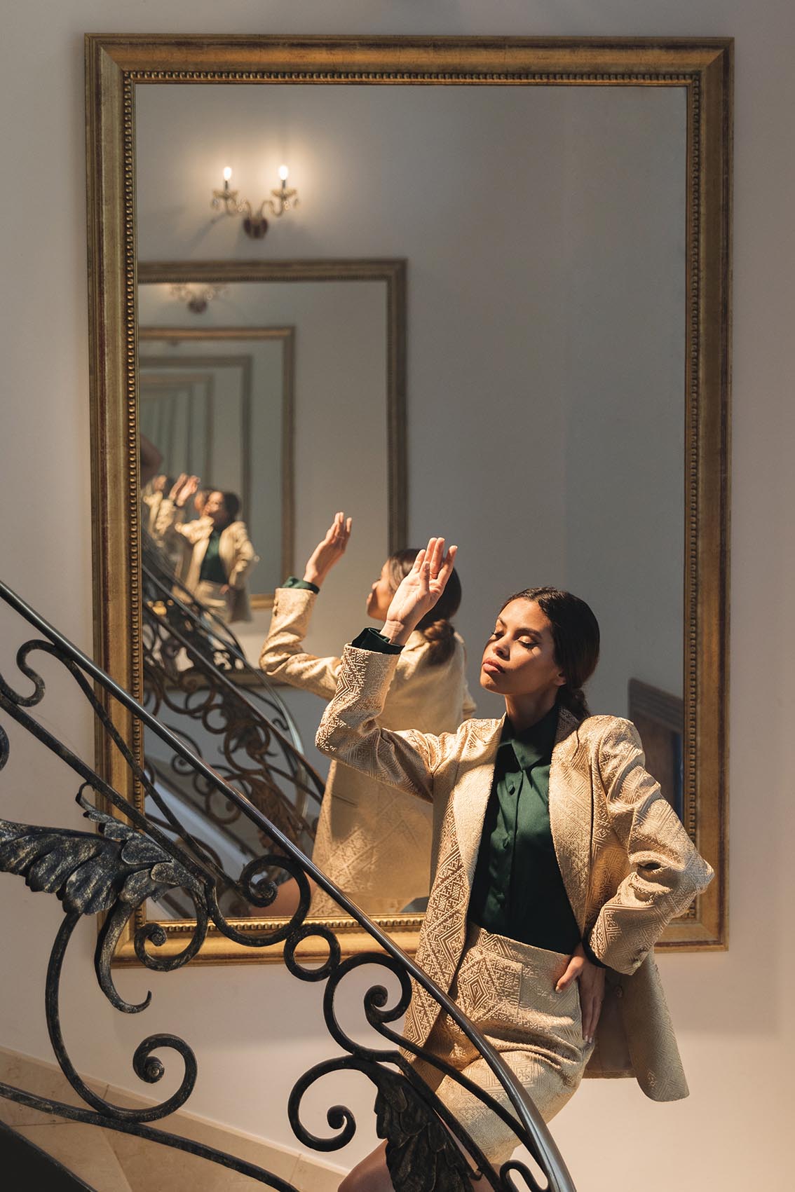 La couleur est pensée comme un accent émotionnel : verts profonds, ors patinés, touches de rose vibrant, noirs et ivoire contrastés. Les pièces dialoguent avec l’architecture, les mosaïques, les miroirs, prolongeant l’idée d’un vêtement qui vit avec l’espace.