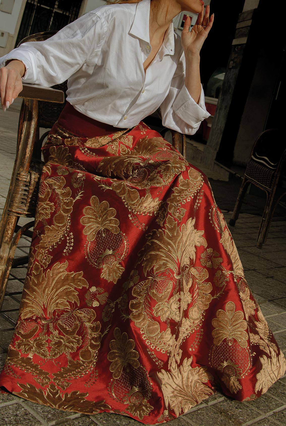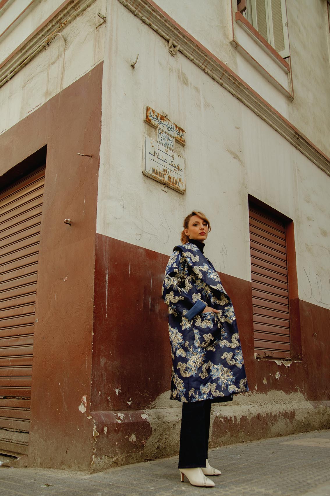 Le fil conducteur de cette collection est la matière. Brocards bleu royal, or antique, bordeaux profond… Chaque tissu évoque un fragment d’histoire, un héritage transmis de main en main. Le manteau Casablanca Brochet ou la jupe Benchrif Evening incarnent cette noblesse retrouvée : une couture de caractère, ancrée dans la mémoire marocaine mais ouverte au monde. Le luxe selon Salima Chaieb est celui du temps, du geste, du savoir-faire artisanal réinterprété.