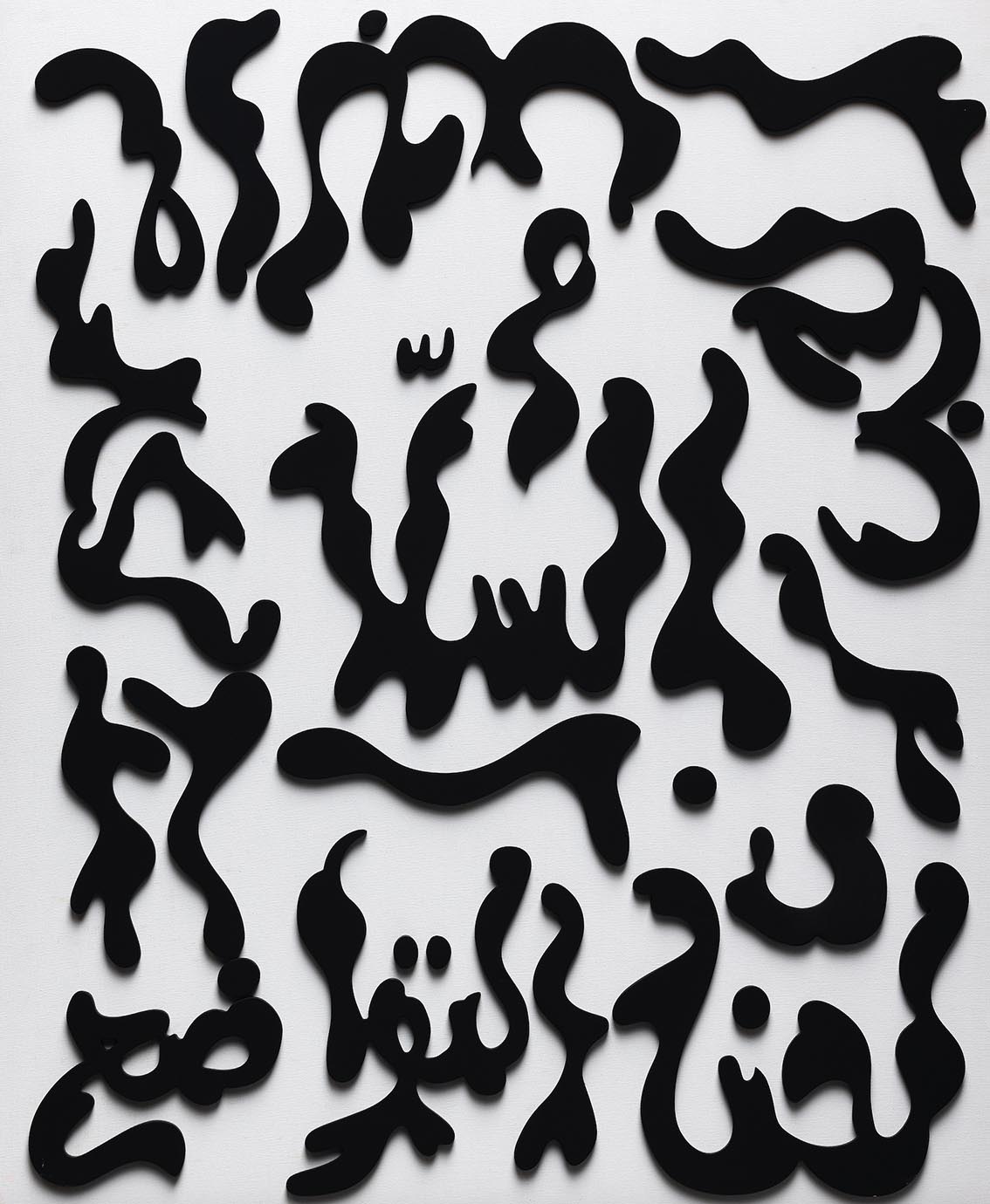 Les formes organiques noires en relief de Malika Agueznay émergent quant à elles comme des présences charnelles, silhouettes biomorphiques qui semblent affleurer hors du mur.